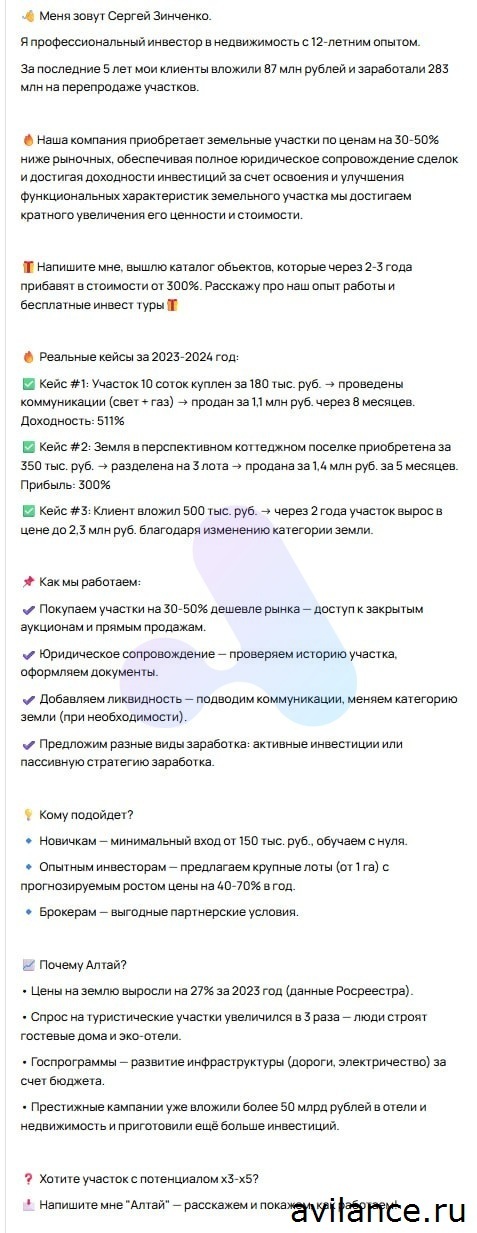— Инвестиции: публикации в Москве и Краснодаре, где выше спрос на земельные проекты; подбор работающих креативов с упором на доходность и надёжность.