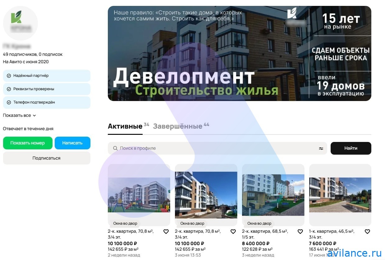 1: Оформили профиль на Авито как застройщик (баннеры, карточки ЖК).