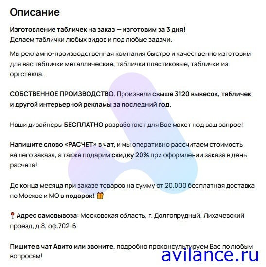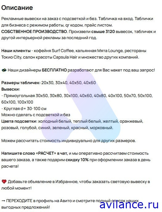 Создали объявления по ключевым направлениям: вывески, таблички, печать. Прописали характеристики товаров, актуальные цены, оформили тексты с УТП.