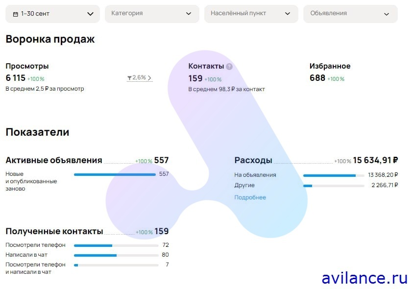 159 контактов при бюджете 15 634 ₽ — 98 ₽ за контакт.